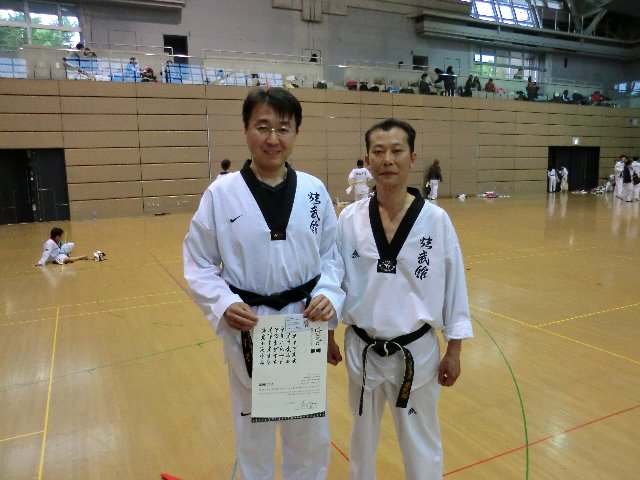 最後は参加者みんなの前で、わが山梨県テコンドーアカデミーの山さんがWTF認定証と黒帯を
