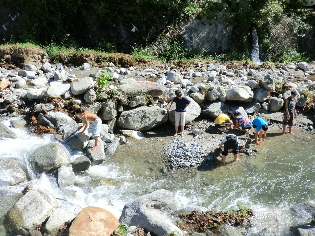 川は昨日の雨にも負けず、きれいな流れで子供たちは大はしゃぎ